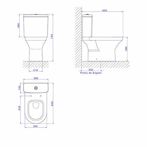 A bacia possui saída de esgoto vertical e deve ser fixada no piso. É fabricada com argila, feldspato, caulim, vidrados e corantes inorgânicos, seguindo as Normas / Decretos: NBR-16727-2 e NBR-16727-1.