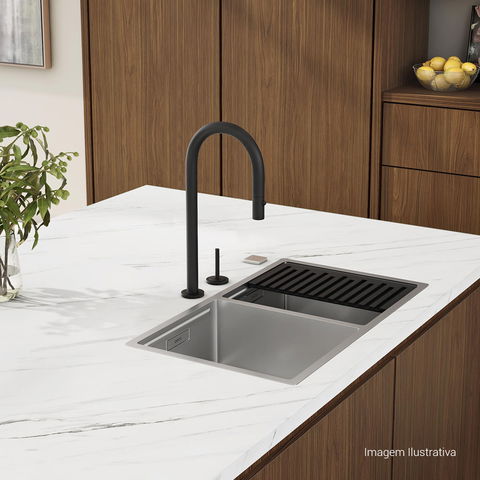 Bica móvel, permite o direcionamento do fluxo de água. Maior conforto e maior funcionalidade ao produto (na cozinha permite a utilização de cuba dupla, verifique medida do produto e da cuba dupla).
